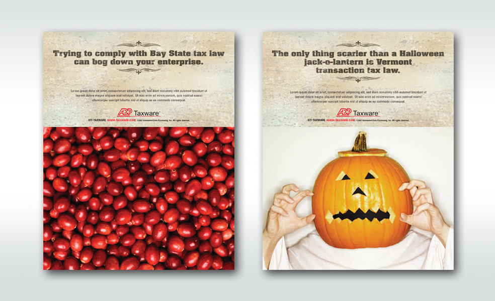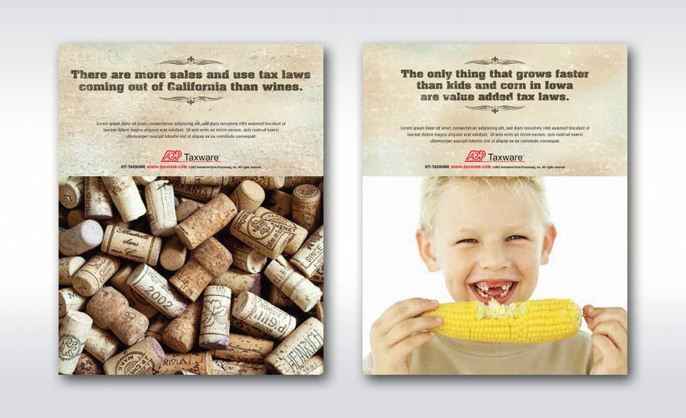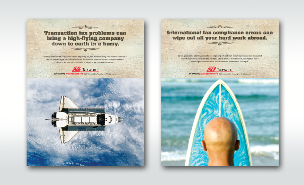 Series of awareness ads for ADP Taxware, a used tax software application.